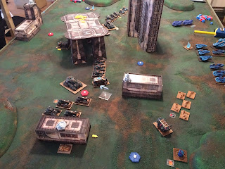 We rolled up the terrain using the Tournament rules in the main pack. Terrain in Planetfall works in the Abstract in that buildings block LOS to everything other than flyers.