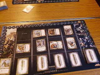 The founders boxes are big chunky things, with two mats, 4 campaign decks, 14 boosters, rules, paper mats, special foil cards for each alliance, a founders pin and special life counters, plus a deck box were just about worth the discounted £120 we paid for them (a warhammer fest discount).